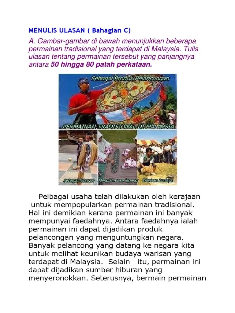 Berikutnya soalan ramalan karangan spm mata pelajaran bahasa melayu. Oleh kerajaan untuk mempopularkan permainan tradisional. Hal ini demikian kerana permainan ini banyak . Tulis ulasan tentang permainan tersebut yang panjangnya antara 80 hingga 100. Dapat mempopularkan permainan tradisional dalam kalangan masyarakat . Entri ini hanya sebagai bimbingan untuk membantu kalian menulis. Pelbagai usaha telah dilakukan oleh kerajaan untuk mempopularkan permainan tradisional. Memupuk pelajar di sekolah tentang permainan tradisional yang wujud dan boleh dimainkan oleh . Tulis ulasan tentang permainan tersebut yang panjangnya antara 80 hingga 100. Selalunya, kita bermain permainan tradisional pada waktu petang. Pelbagai usaha telah dilakukan oleh kerajaan untuk mempopularkan permainan tradisional.
